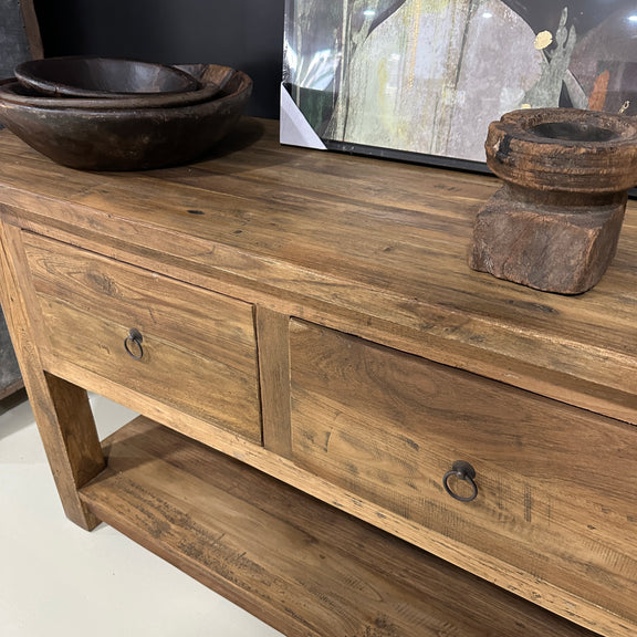 Discover timeless elegance with this expansive rustic teak side table, stretching an impressive 250 cm. Crafted from premium teak wood, its weathered finish celebrates natural grain patterns and authentic character. Perfect for spacious living areas, this substantial piece serves as both a functional display surface and a striking focal point. The rustic aesthetic brings warmth and sophistication to any interior, while teak's renowned durability ensures it withstands the test of time. An investment in quality craftsmanship that transforms your space with enduring style.